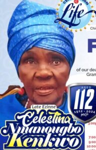 The family of the late Christopher Onuoha Kenkwo of Umuduruewuru, Umuezeala Nsu Autonomous Community, Ehime Mbano Local Government Area, Imo State, is set to commit their mother, Ezinne Celestina Nmanougbo Kenkwo (Egodiya), aged 112 years, to rest.